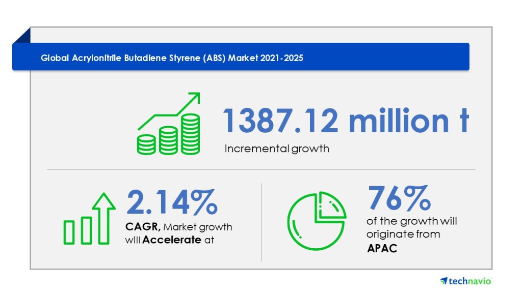 During 2021-2025 acrylonitrile butadiene styrene market size will grow by 1387.12 about at a CAGR of almost 3%. US is contributing the major share in this growth.